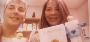 I met Virginia, a nurse at the Cancer Centre at her “Stronger Than you Think” workshop. She encouraged me to go to the Art Hive at the Cancer Centre. This was the real launch of the idea behind this project. Here’s a pic of Virginia and I. In the pic you can see my initial commitment to helping 1 million people smile!